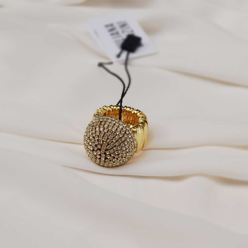 Anel ajustável fios de silicone com banho dourado e aplicação de strass na cor branca em camadas, que criam um efeito de brilho elegante e sofisticado. Uma peça atemporal da marca Juliana Manzini, ideal para valorizar produções tanto do dia a dia quanto da noite.