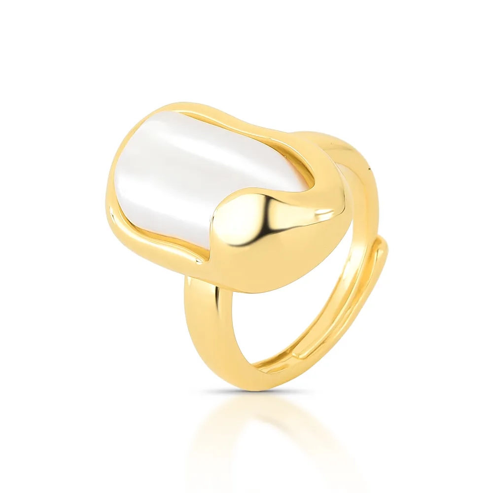 Anel ajustável banho de ouro com aplicação de pérola shell com design assimétrico orgânico.