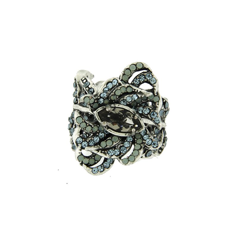 Anel banho prata envelhecido com cristais nas cores azul e fumê