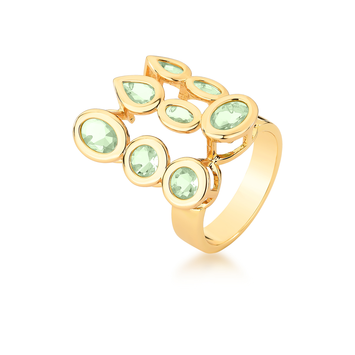 Anel banho de ouro com cristais em formas geométricas na cor verde claro.