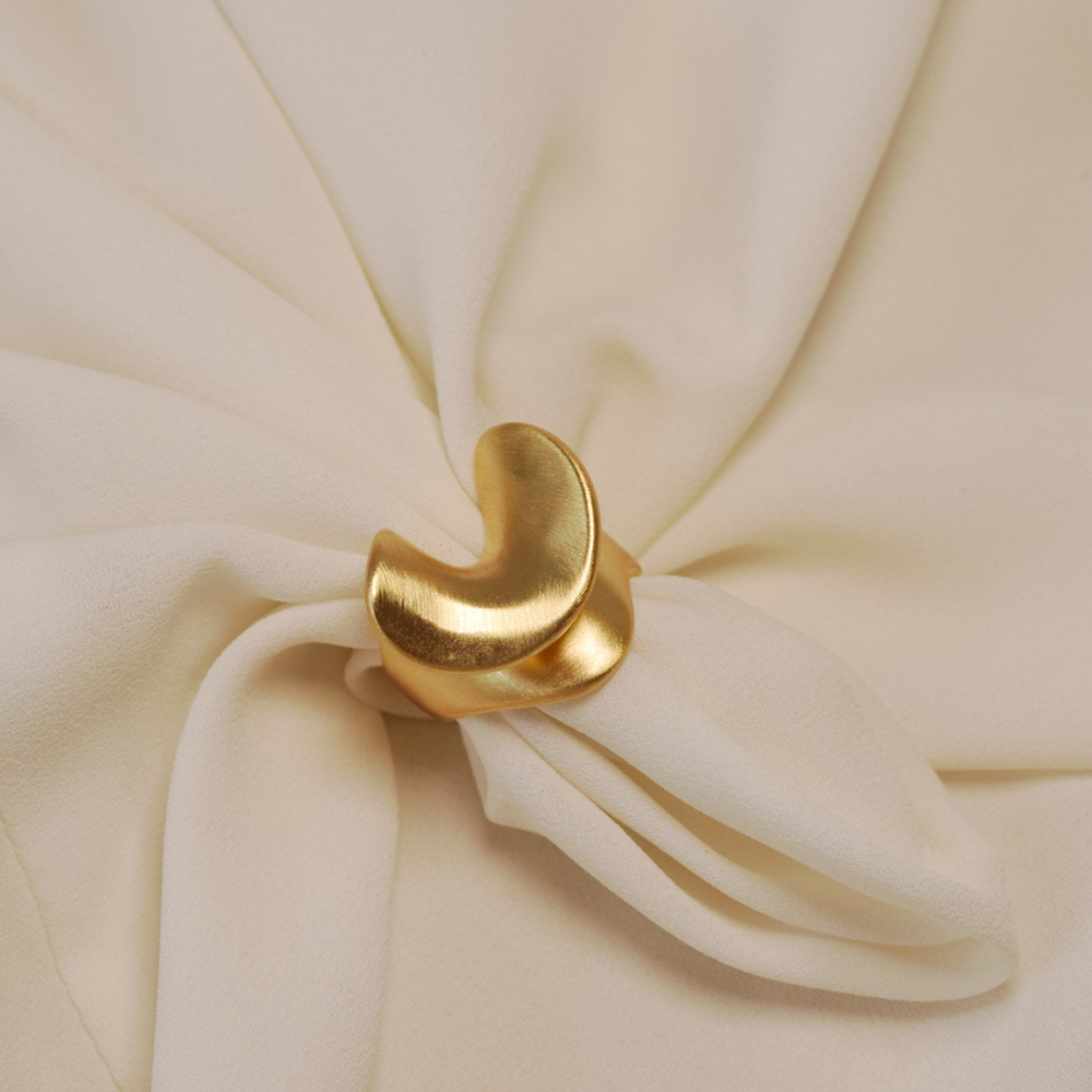 Com curvas suaves e acabamento acetinado, este anel traduz elegância e modernidade em uma única peça. O banho em ouro fosco realça o design escultural e o toque contemporâneo, perfeito para quem valoriza semijoias com personalidade.