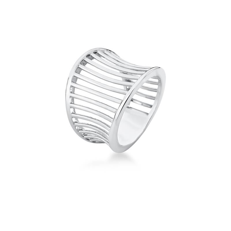 Anel banho de ródio curvado, liso, vazado e texturizado.