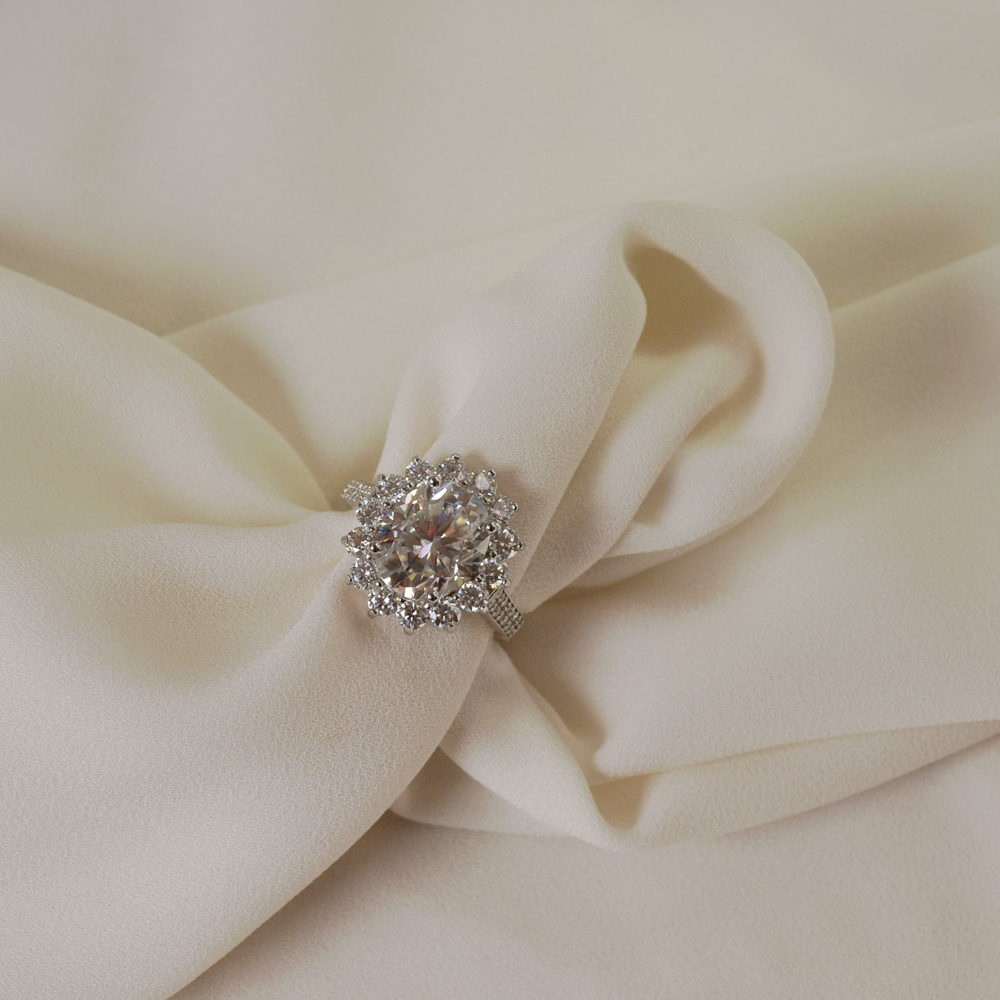 Imponente e sofisticado, o Anel Elaine Palma Oval Moissanite 6.2 ct é uma joia que impressiona pelo brilho intenso e pela pureza de sua pedra central. Confeccionado em prata com banho de ródio, possui acabamento impecável que realça a luminosidade da Moissanite.