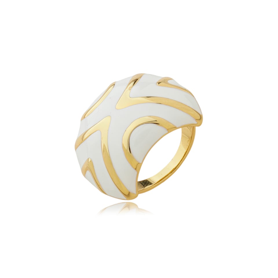 Anel banho de ouro com detalhe no metal esmaltado na cor branco.