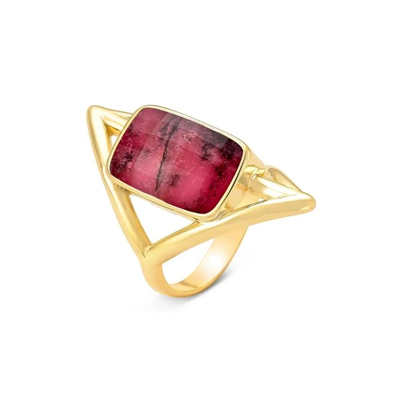 Anel banho de ouro com pedra natural rodonita facetada no formato retangular.