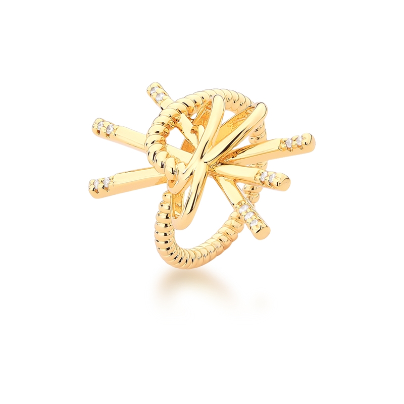 Anel banho de ouro com design de palitos lisos e torcidos com micro zircônias cravejadas na cor branco (cristal).
