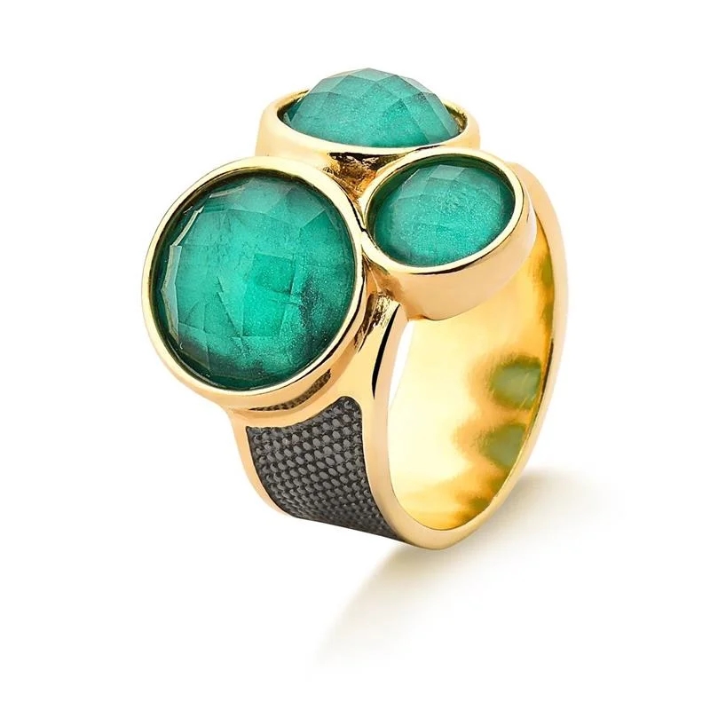 Anel banho de ouro com detalhes no banho ródio negro e 3 pedras naturais redondas esmeralda.