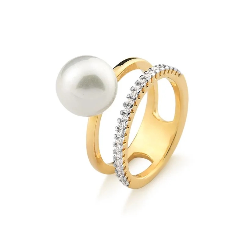 Anel banho de anel com pérola branca shell e micro zircônias cravejadas na cor branca (cristal).