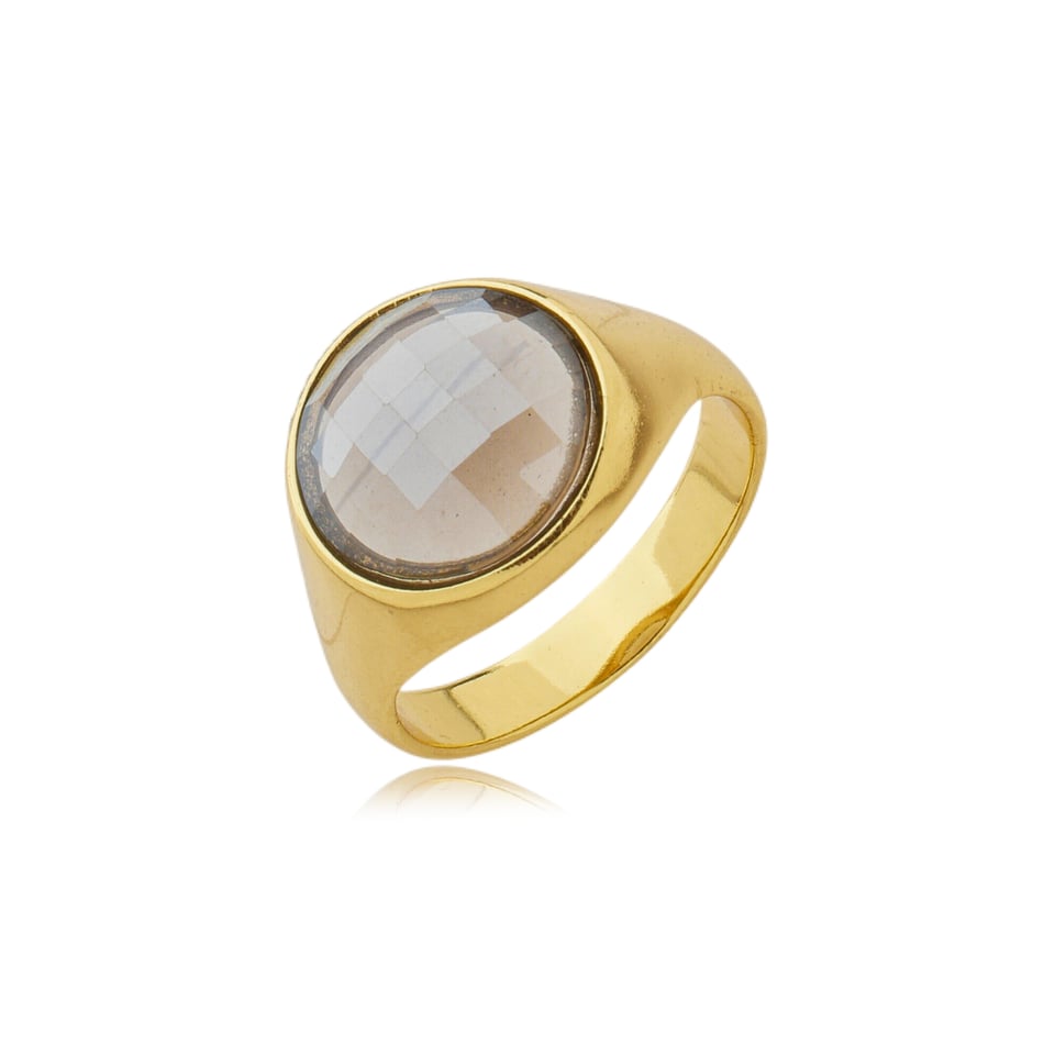 Anel banho de ouro com pedra natural obsidiana fumê facetada.