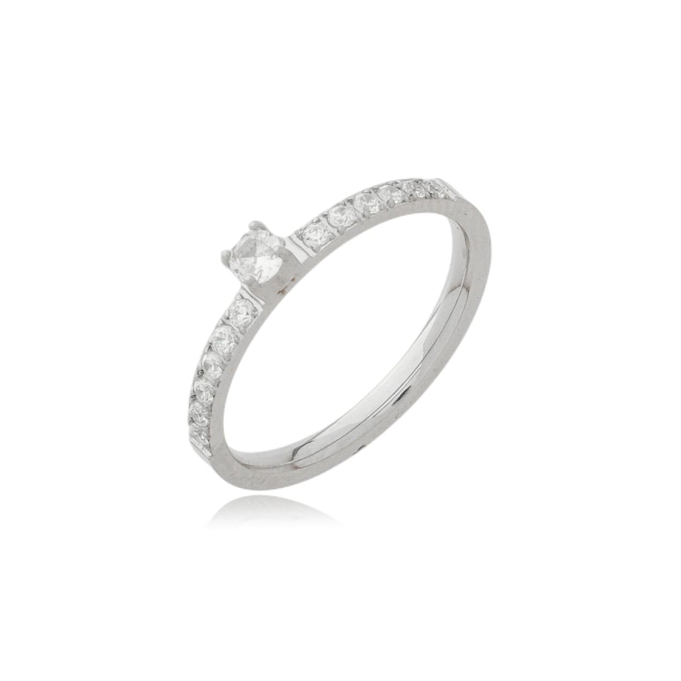 Anel solitário de aço inoxidável com cravação de micro zircônia na cor branco (cristal).