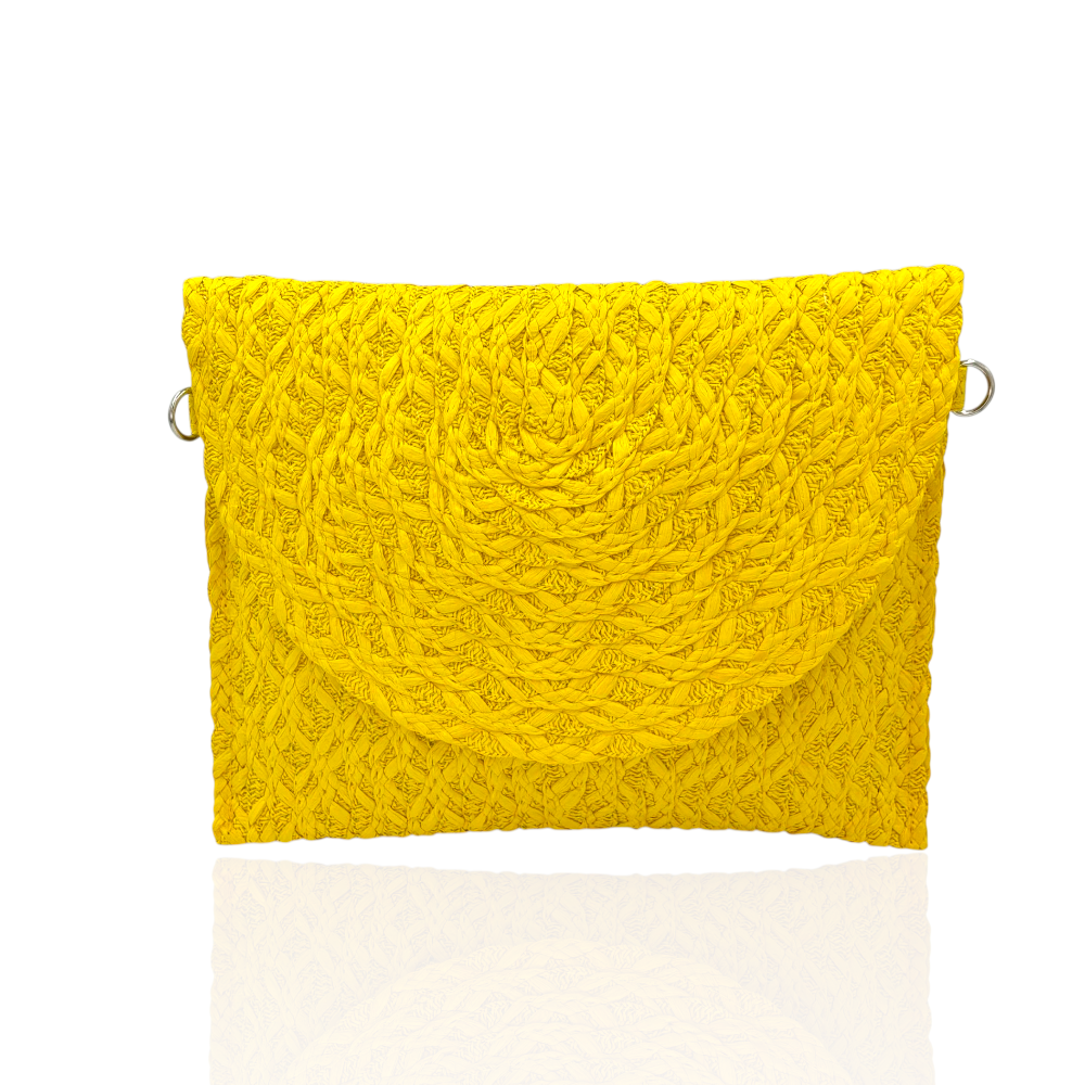Bolsa carteira confeccionada em palha na cor amarela com forro interno de tecido da mesma cor.