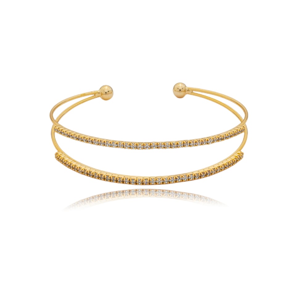 Bracelete banho de ouro aro duplo com abertura e cravação de micro zircônias na cor branco (cristal).