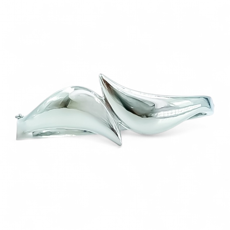 Bracelete banho de ródio no metal liso polido com formato curvado.