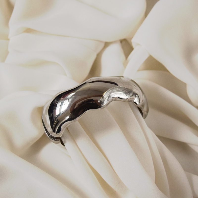 Bracelete banho de ródio com design ondulado em metal liso polido, uma semijoia que traduz elegância contemporânea e sofisticação atemporal. Seu formato orgânico cria um efeito visual fluido e moderno, valorizando o pulso com leveza e estilo.