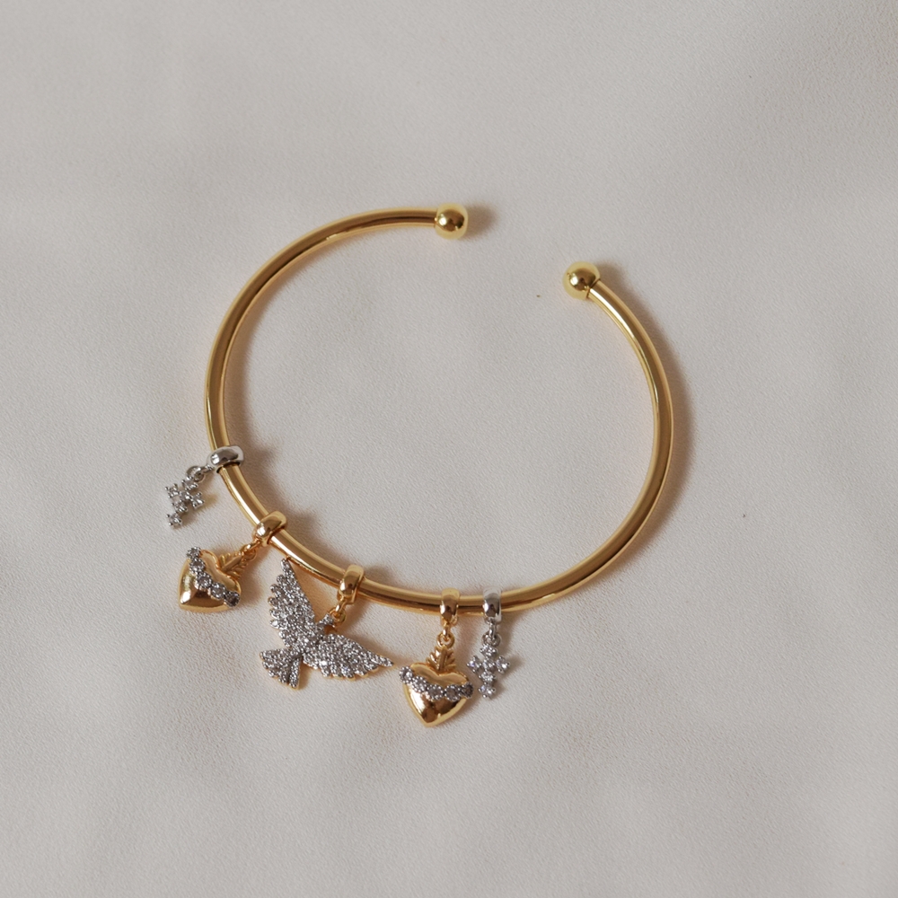 Um amuleto de fé e brilho. Este Bracelete Penduricalhos combina delicados pingentes de Espírito Santo, crucifixo, corações e medalha de N Sra, cravejados com micro zircônias que refletem luz e espiritualidade. Banhado a ouro, é uma semijoia que une significado e sofisticação em cada detalhe.