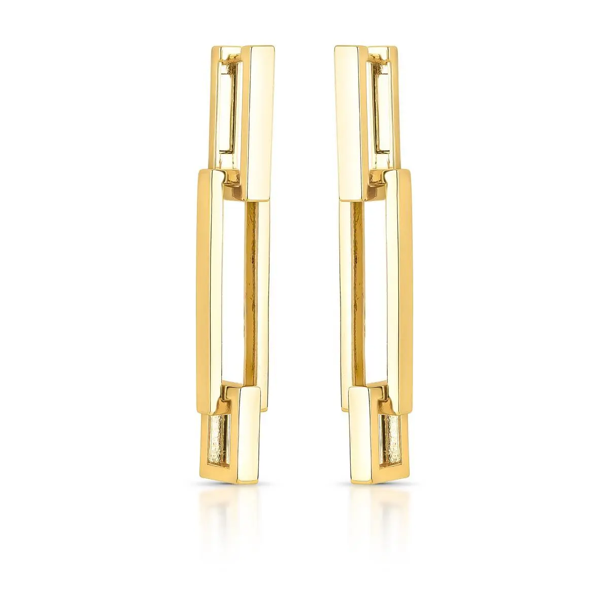 O brinco argola retangular banhado a ouro é uma peça moderna e sofisticada que combina linhas geométricas com um design elegante. A argola lisa possui fecho de click, garantindo praticidade e segurança no uso, enquanto o pingente retangular vazado traz leveza e movimento ao visual.