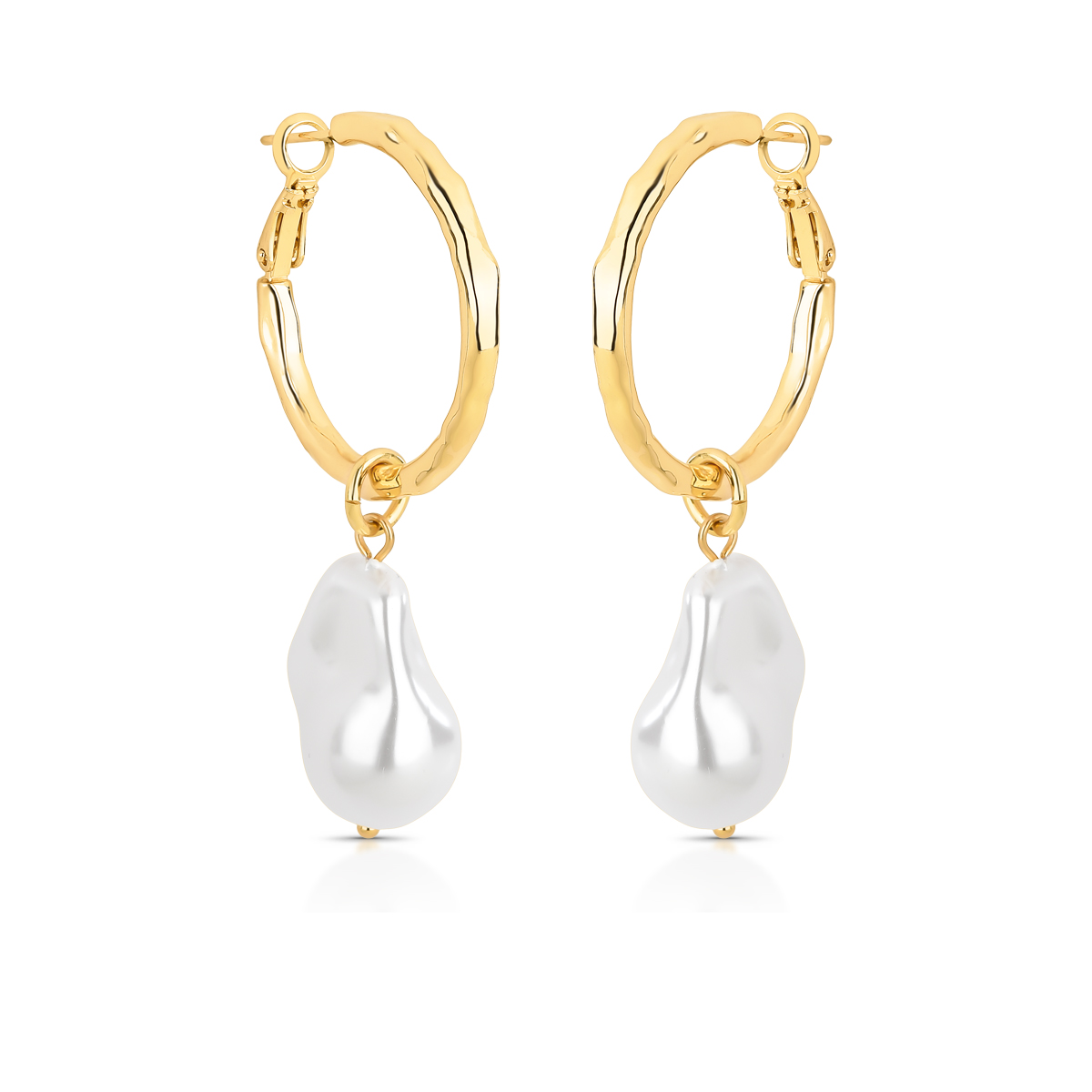 Brinco argola 2 em 1 banhada a ouro com fecho click, unindo praticidade e design elegante. A peça apresenta acabamento trabalhado e pêndulo com pérola shell barroca, criando um contraste sofisticado entre o clássico e o contemporâneo.