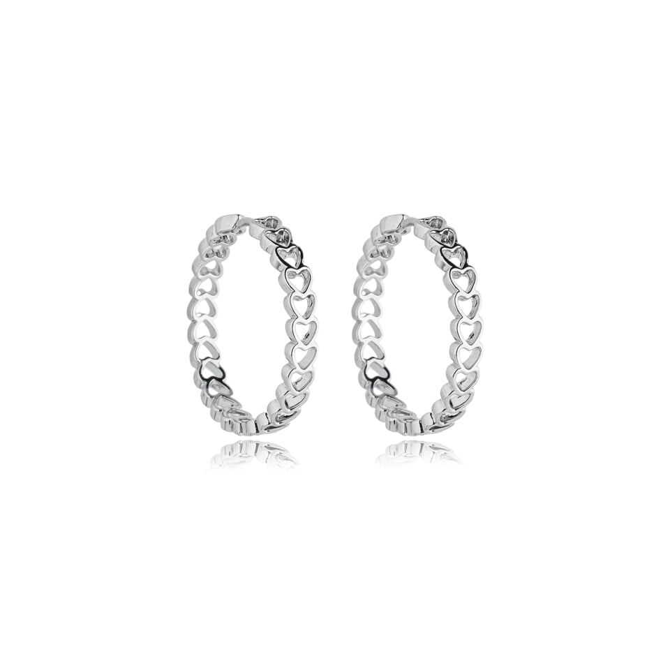 Brinco argola banho de ródio no metal com detalhes de corações vazados.