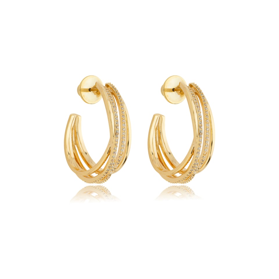 Brinco argola aberta banho de ouro com cravação de micro zircônias na cor branco (cristal).