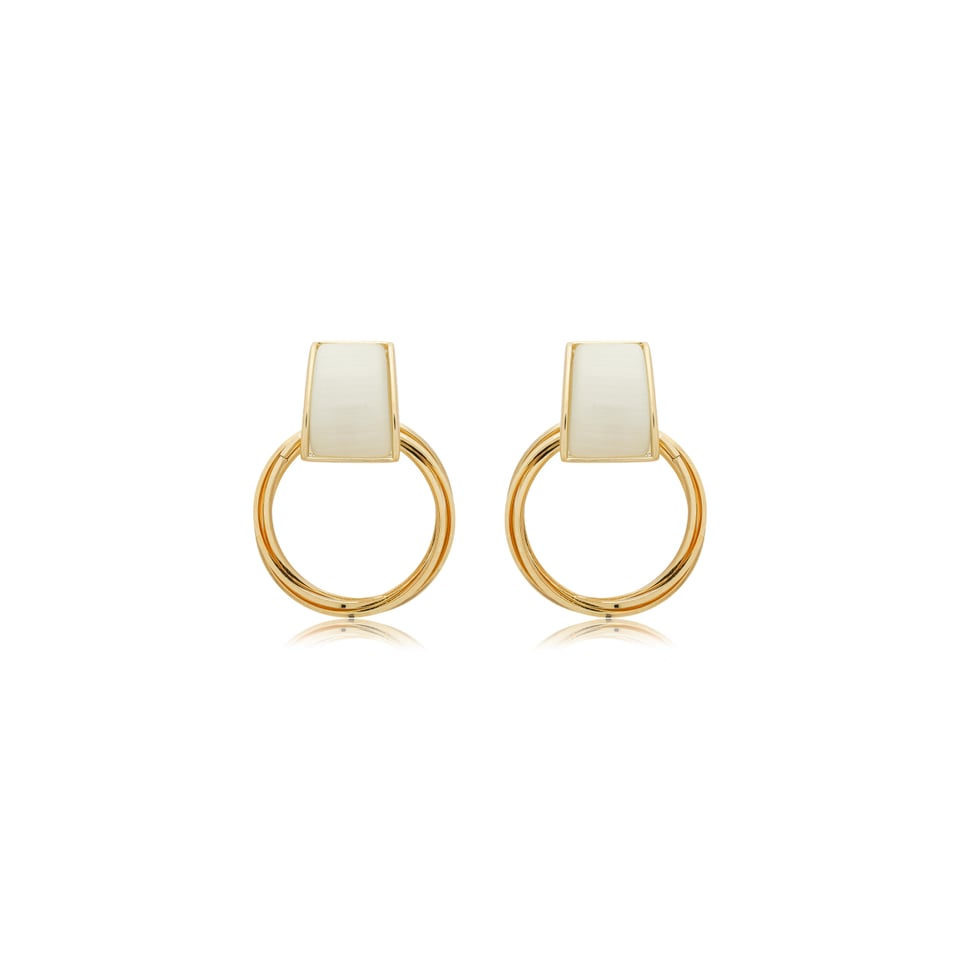 Brinco banho de ouro com base retangular de cristal olho de gato e 3 argolas entrelaçadas.