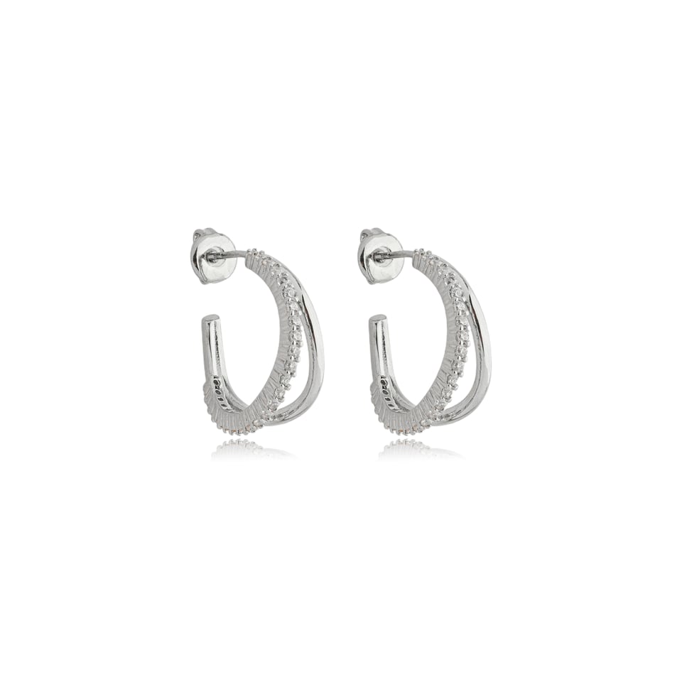 Brinco argolinha aberta banho de ródio com dois aros, sendo um liso e outro com micro zircônias cravejadas na cor branco (cristal).