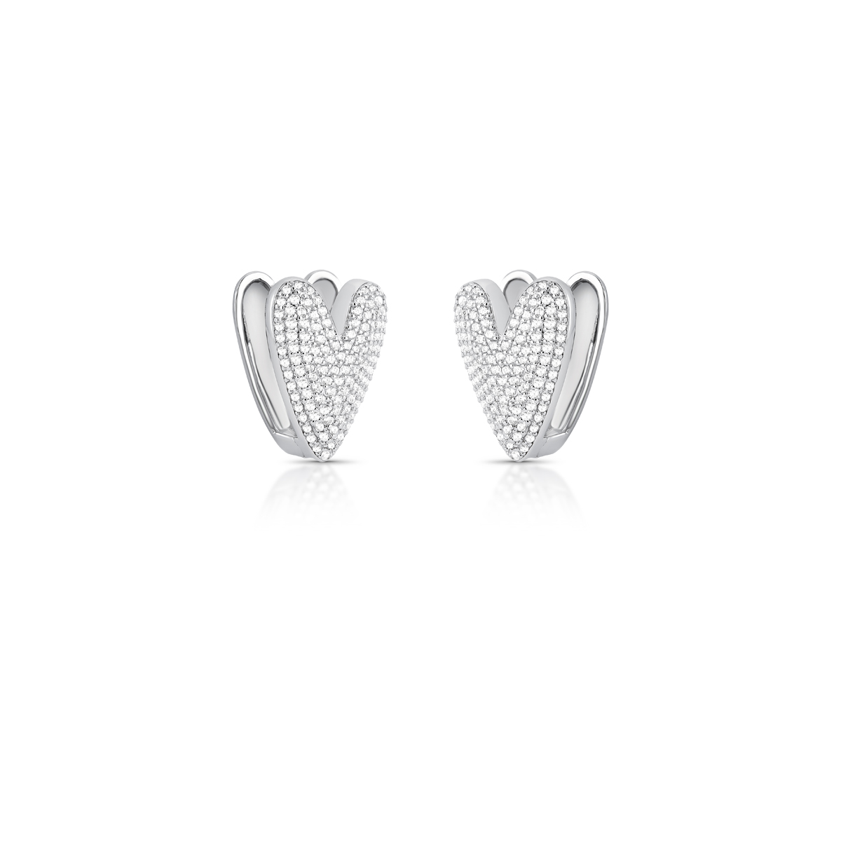 Brinco argolinha banho de ródio com design de coração com micro zircônias cravejadas na cor branco (cristal).