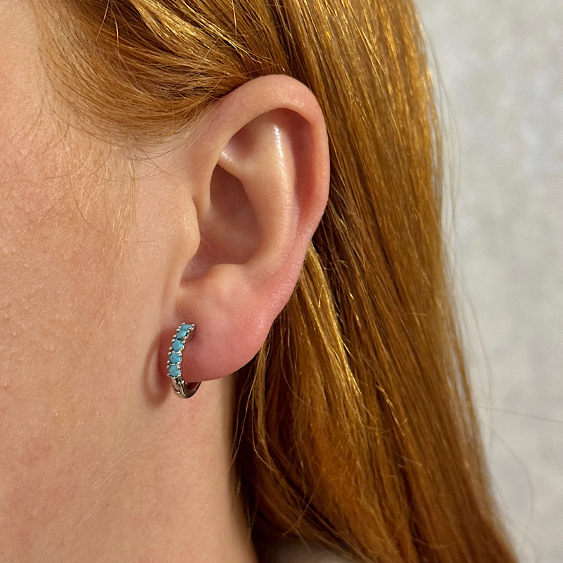 Brinco argolinha segundo furo banho de ródio com cravação de cristal na cor turquesa.