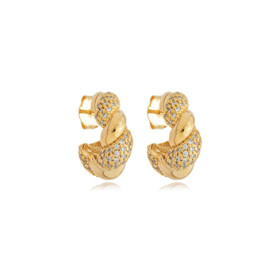 Brinco argolinha aberta banhado a ouro com design torcido e cravação de micro zircônias na cor branco (cristal).