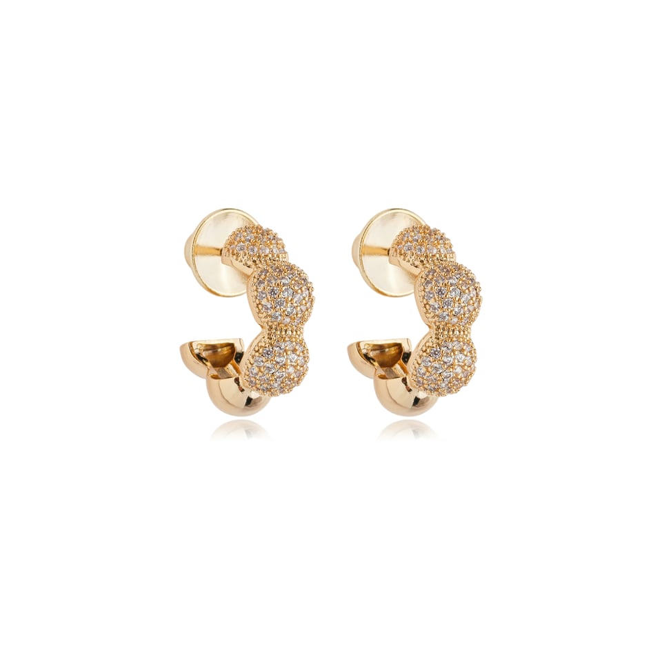 Brinco meia argolinha banho de ouro com cravação de micro zircônias na cor branco (cristal).