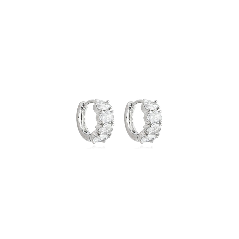 Brinco argolinha banho de ródio com cravação de zircônias ovais e gotas na cor branco (cristal).