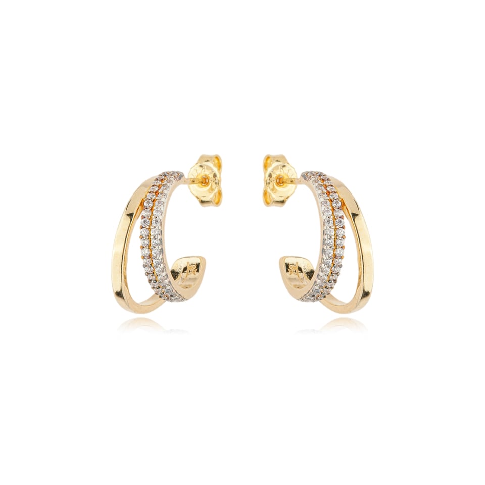 Brinco banho de ouro com design de aros duplos e micro zircônias cravejadas na cor branco (cristal).