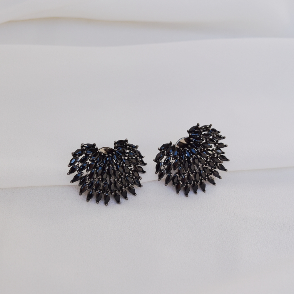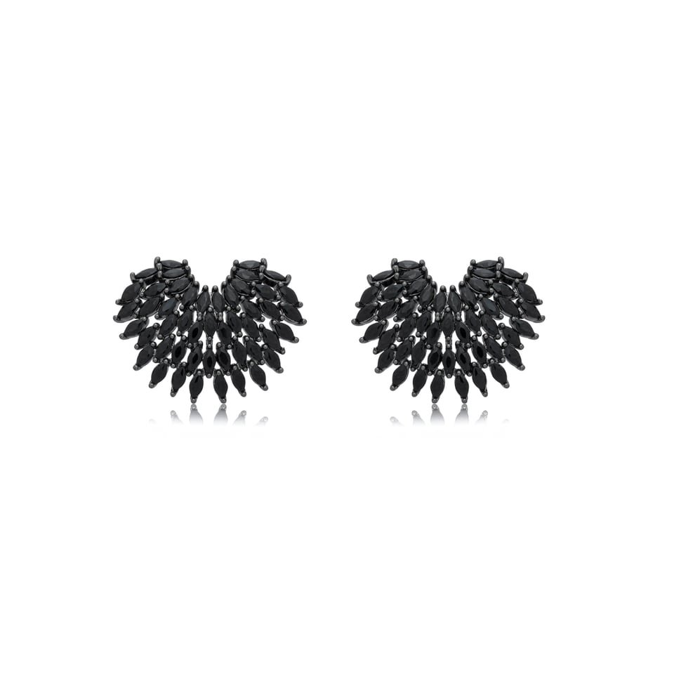 Confeccionado em metal com banho de ródio negro, o brinco possui acabamento impecável e aplicação de zircônias na cor preta (black), que garantem brilho intenso e contraste elegante. O efeito escuro do ródio negro valoriza ainda mais o brilho das pedras, criando uma peça versátil e impactante.