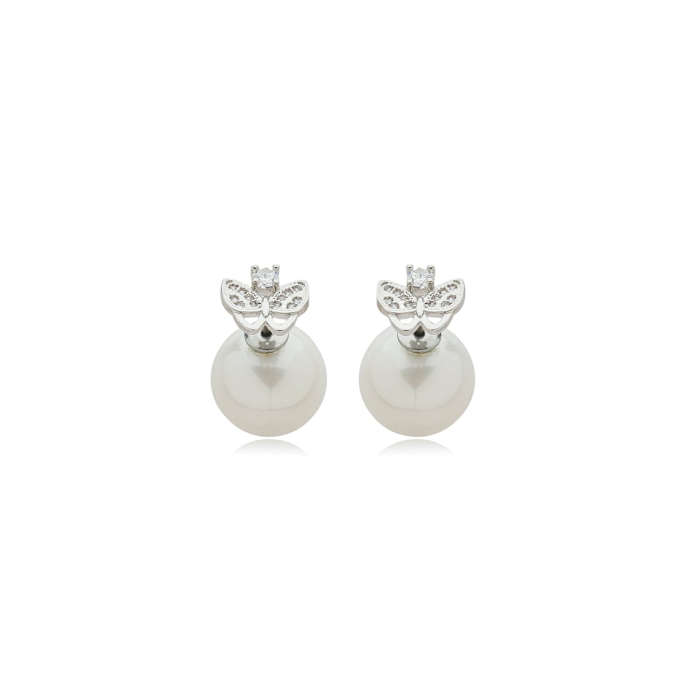 Brinco banho de ródio sendo a frente de borboleta cravejada com micro zircônias na cor branco (cristal) e a parte de trás de pérola.