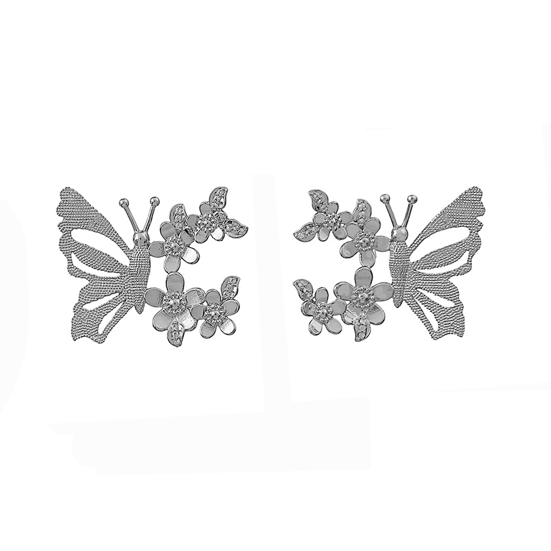 Brinco banho de ródio com metal texturizado em forma de borboleta e aplicação de flores.