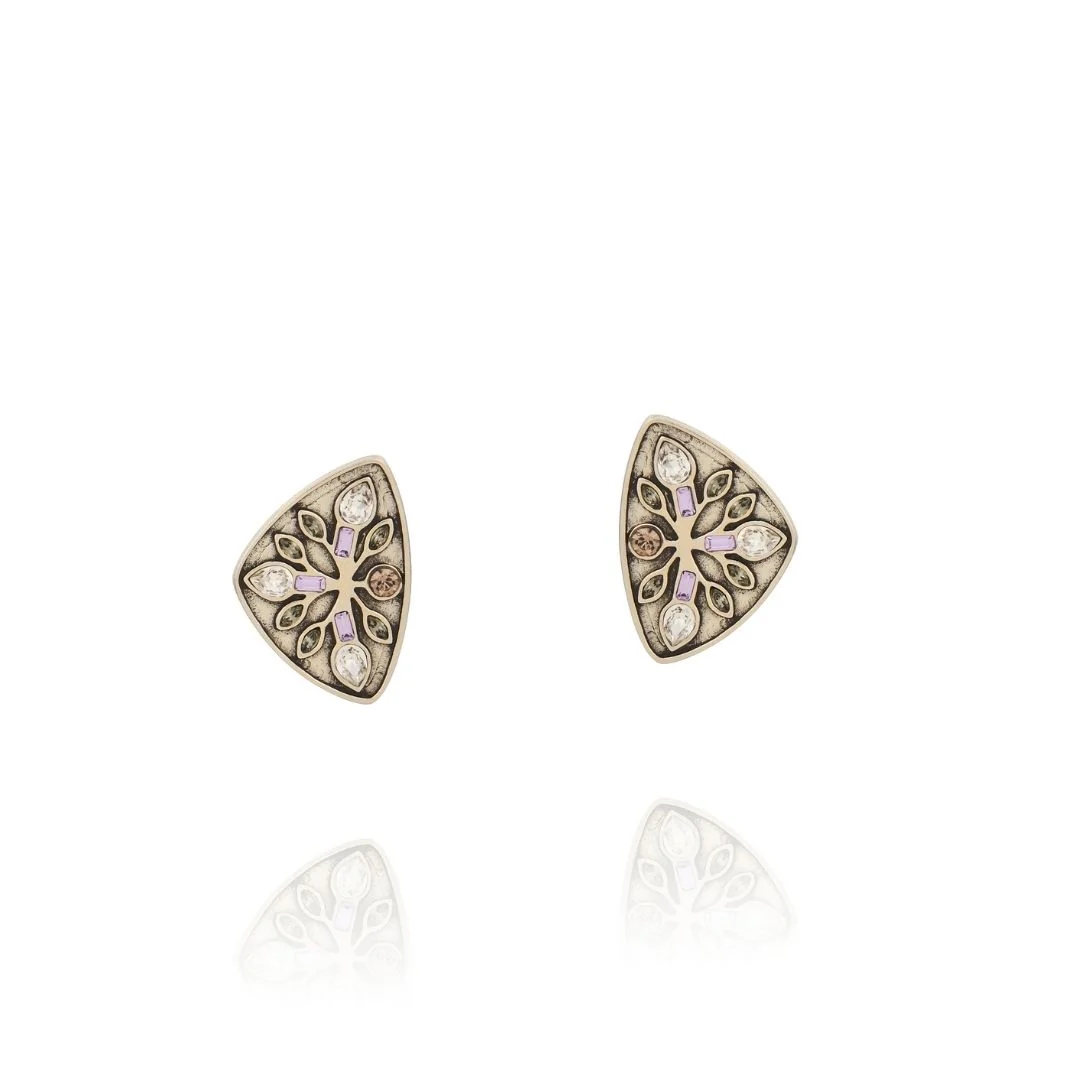 O brilho dos cristais é o destaque deste brinco Camila Klein, que combina lapidações delicadas em tons neutros e lilás com o acabamento em prata velho. O design triangular traz detalhes trabalhados que refletem a luz com sutileza e sofisticação. Uma peça versátil, elegante e perfeita para iluminar o look no dia a dia ou em produções especiais.