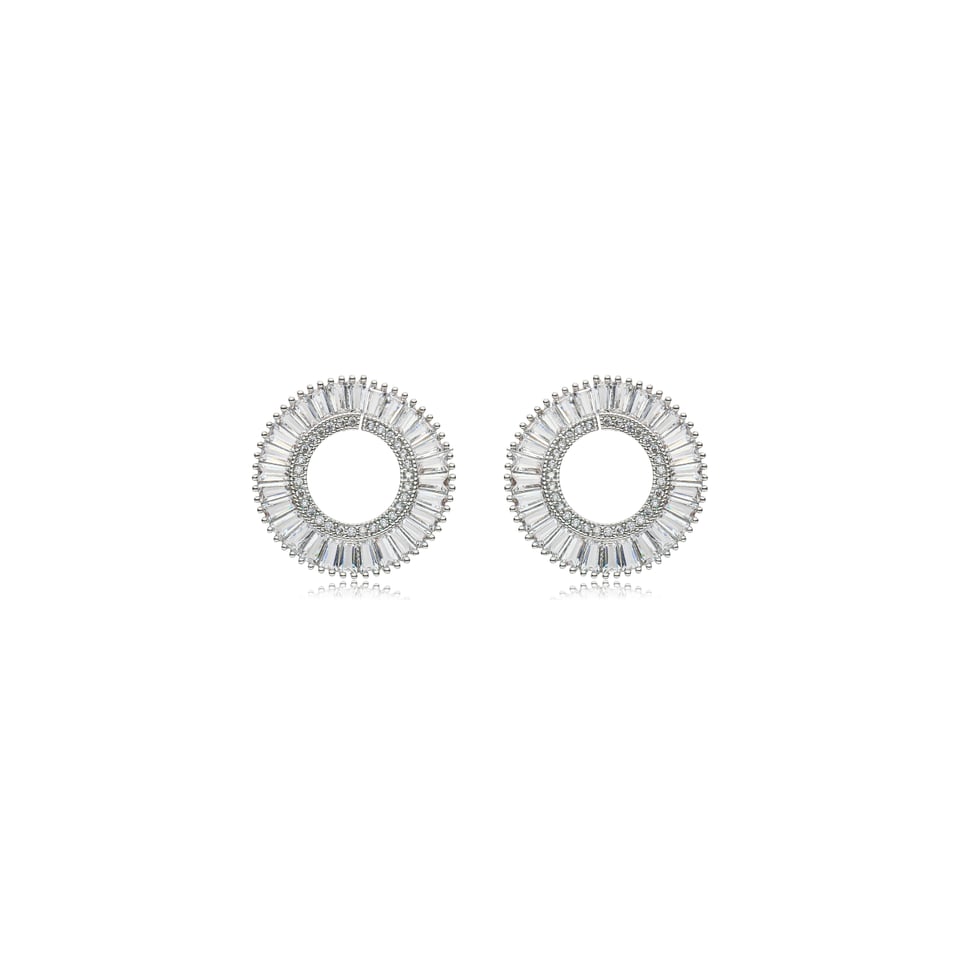 Brinco banho de ródio com cravação de micro zircônias e zircônias baguetes na cor branco (cristal).