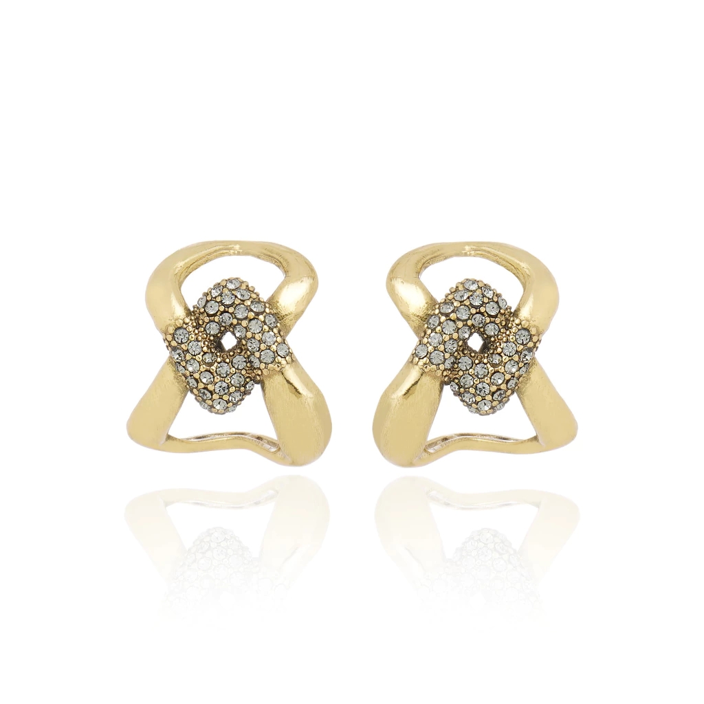 Com acabamento em ouro vintage, o brinco explora o contraste entre superfícies lisas e o brilho sutil de strass nas tonalidades black diamond e crystal, criando um efeito sofisticado e versátil. As zircônias brancas em lapidação trillion, aplicadas com cravação invertida, intensificam o jogo de luz e destacam a geometria como elemento central da peça.