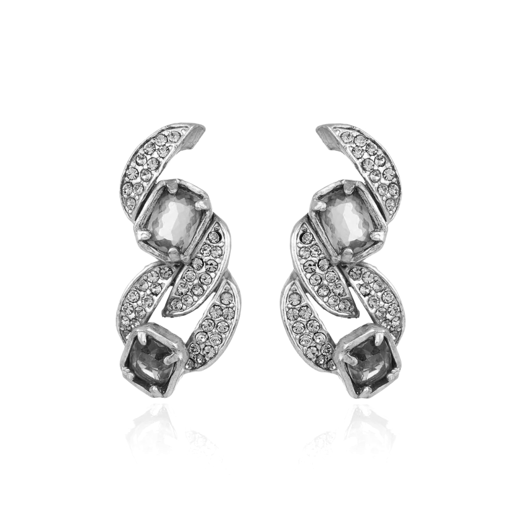 Brinco banho de prata vintage com design de elos e aplicação de cristais nas cores fumê e branco (cristal).