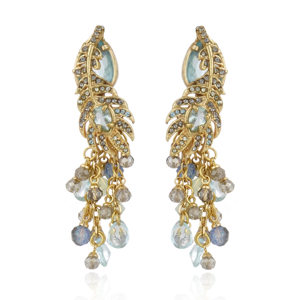 O Brinco Pavão de Claudia Arbex combina cristais em lapidações gota e navete com o elegante banho ouro vintage. Inspirado na plumagem do pavão, traz tons sofisticados, brilho delicado e design autoral.