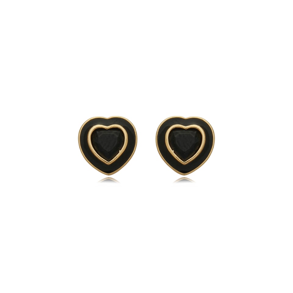 Brinco banho de ouro no formato de coração com detalhe de metal esmaltado preto e cristal da mesma cor.