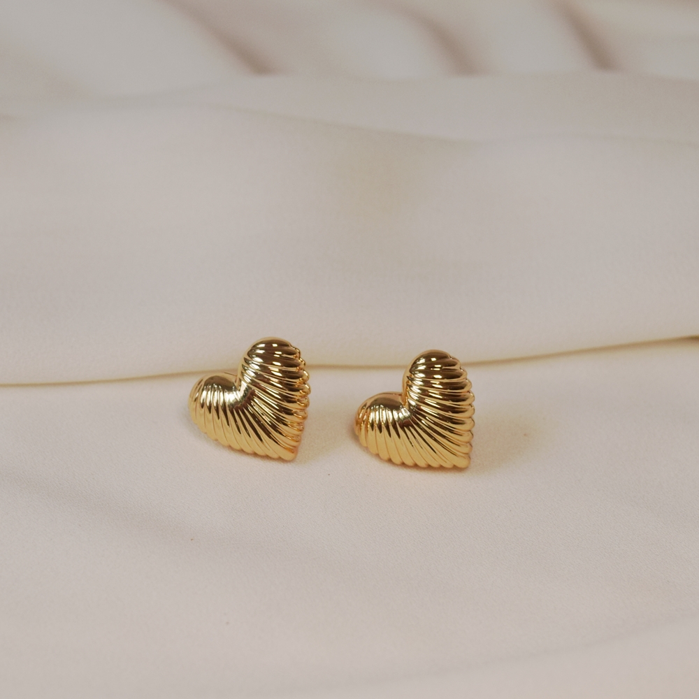 Brinco em formato de coração, confeccionado em semijoia com banho ouro e acabamento frisado no metal, que adiciona textura e brilho sutil. Delicado e cheio de charme, é a peça ideal para iluminar o dia a dia e trazer um toque romântico e moderno às suas produções.