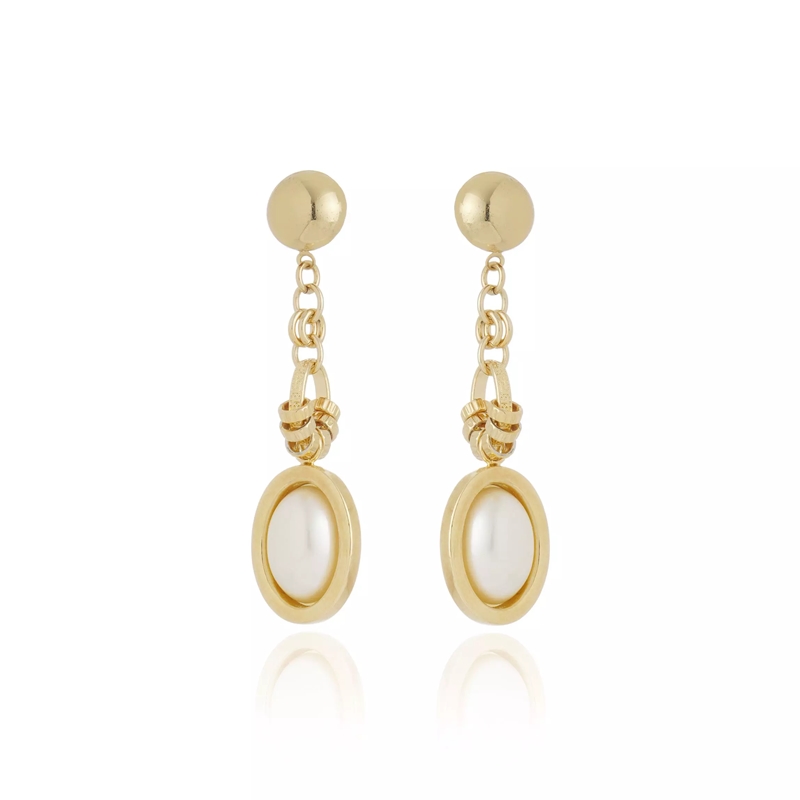 Brinco feito em bronze com banho de ouro 18k, com pérola central em moldura oval.