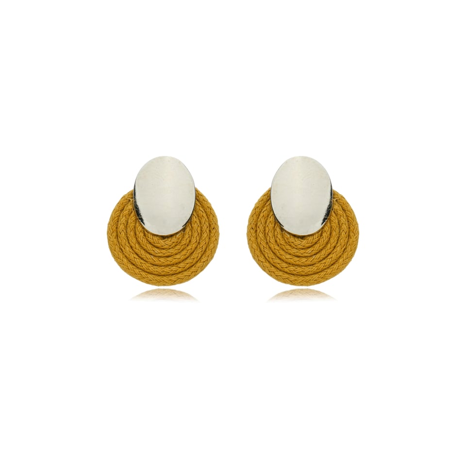 Brinco banho prateado com mandala produzido artesanalmente em fios 100% de algodão na cor mostarda.