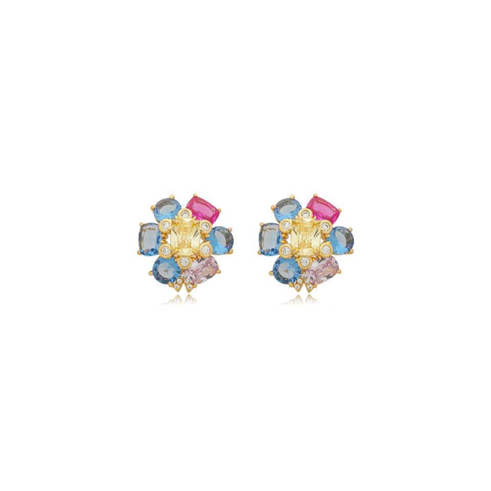 Brinco banho de ouro com design de flor com cravação de zircônias em tons de azul, pink, amarelo e branco (cristal).