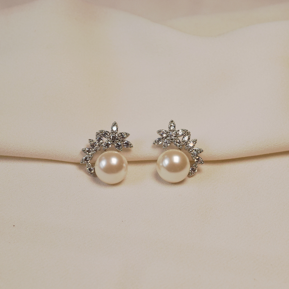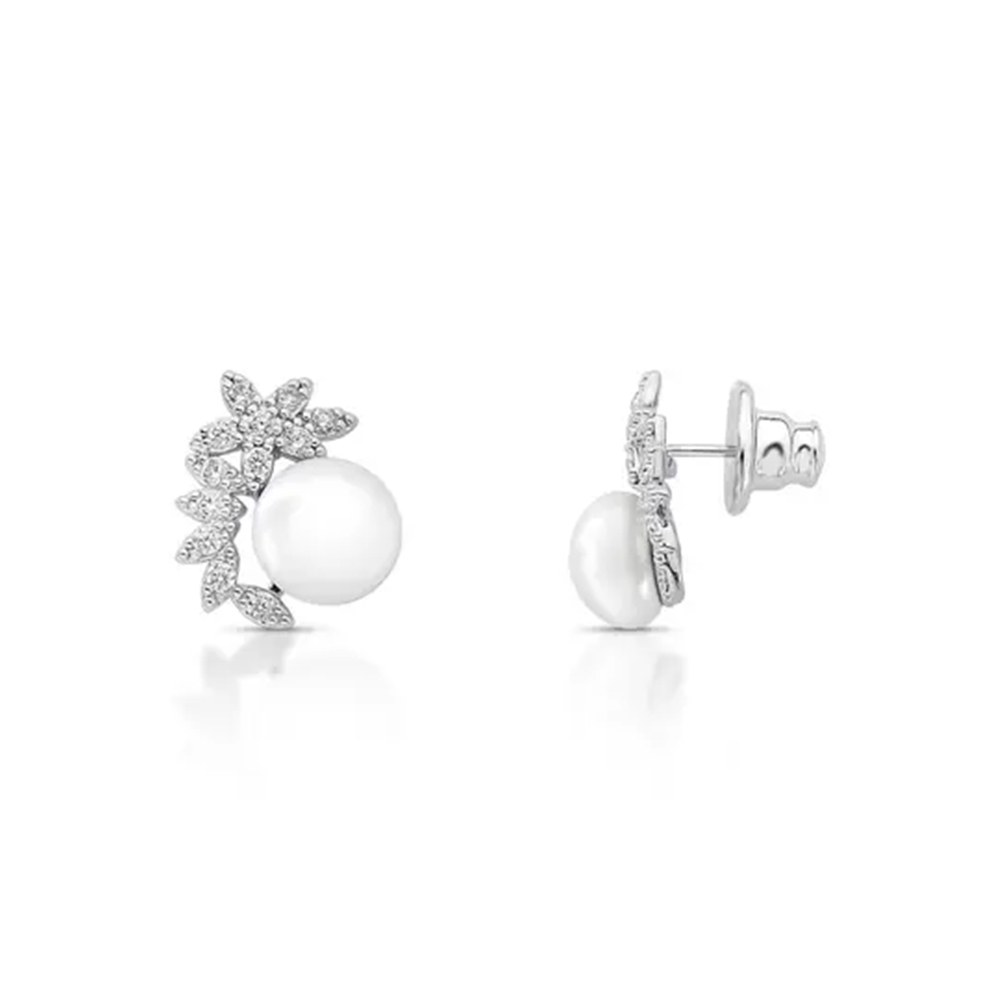 Brinco delicado em semijoia, desenvolvido em banho de ródio, com detalhe de flor adornada por zircônia branca. A aplicação de pérola shell adiciona um toque clássico e sofisticado, equilibrando brilho e suavidade.