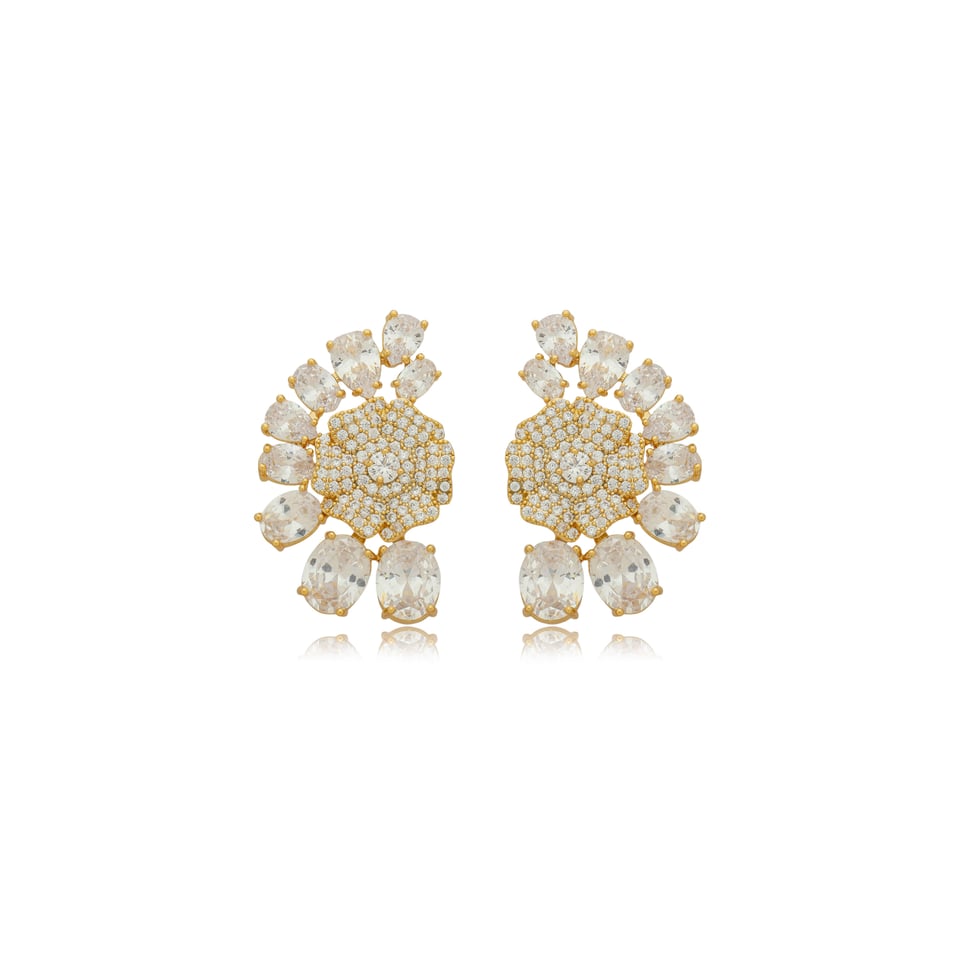 Brinco banho de ouro com design de flor e micro zircônias cravejadas na cor branco (cristal).