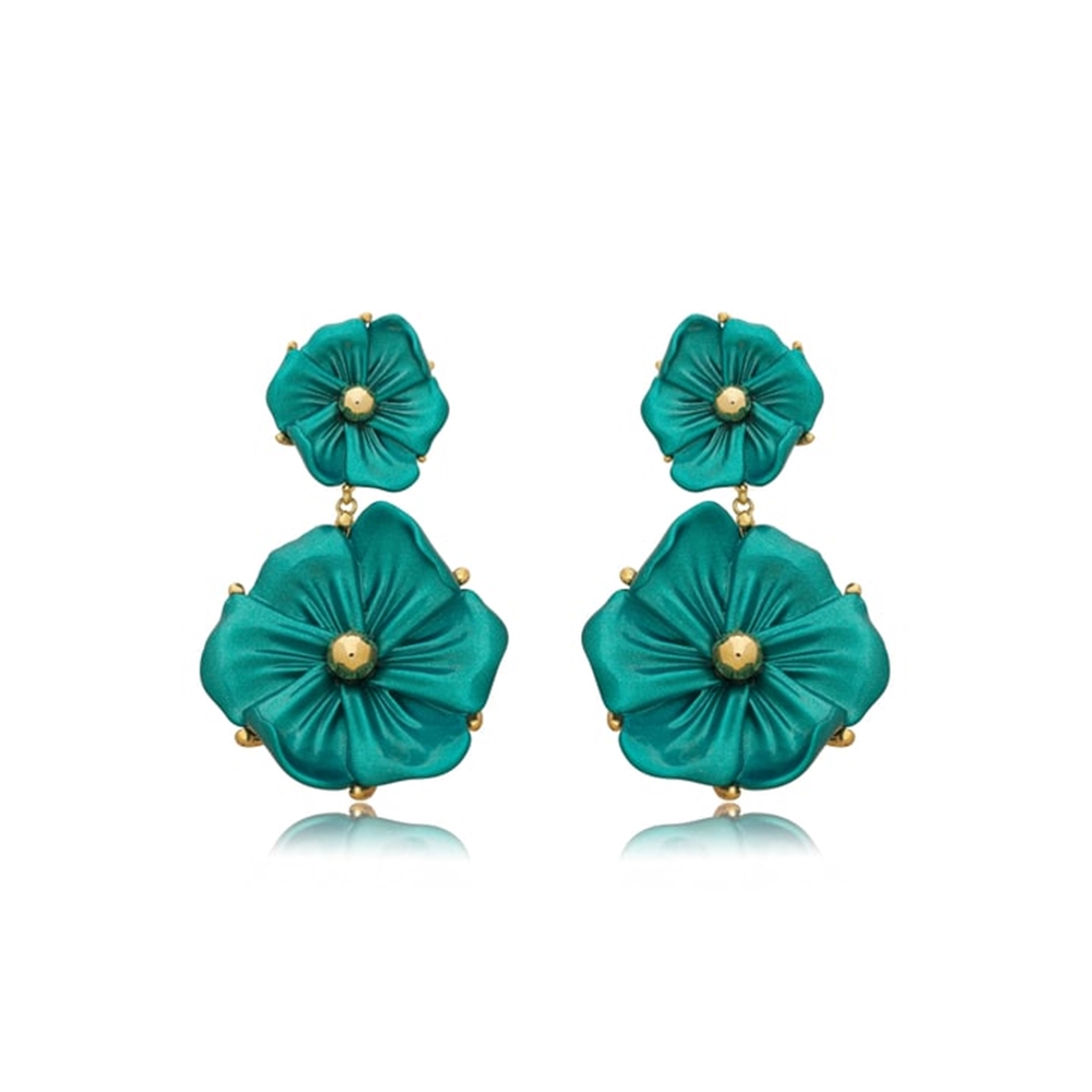 Brinco banho de ouro com flores de resina na cor verde e miolos de esferas de metal.