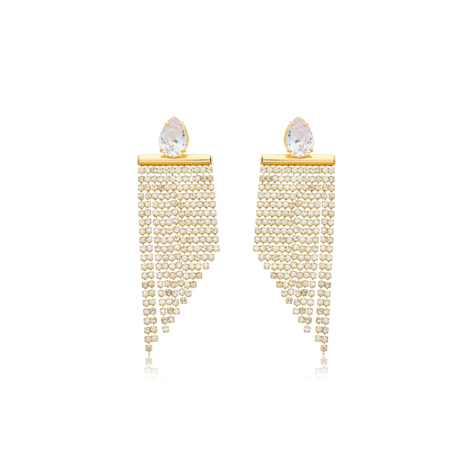 Brinco banho de ouro com base de gota com aplicação de cristal e franjas na diagonal de cristais na cor branco (cristal).