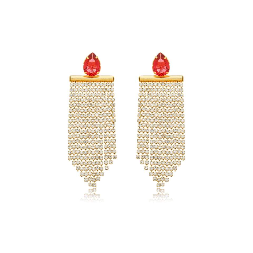 Brinco banho de ouro com base de gota com aplicação de cristal na cor rosa e franjas de cristais na cor branco (cristal).