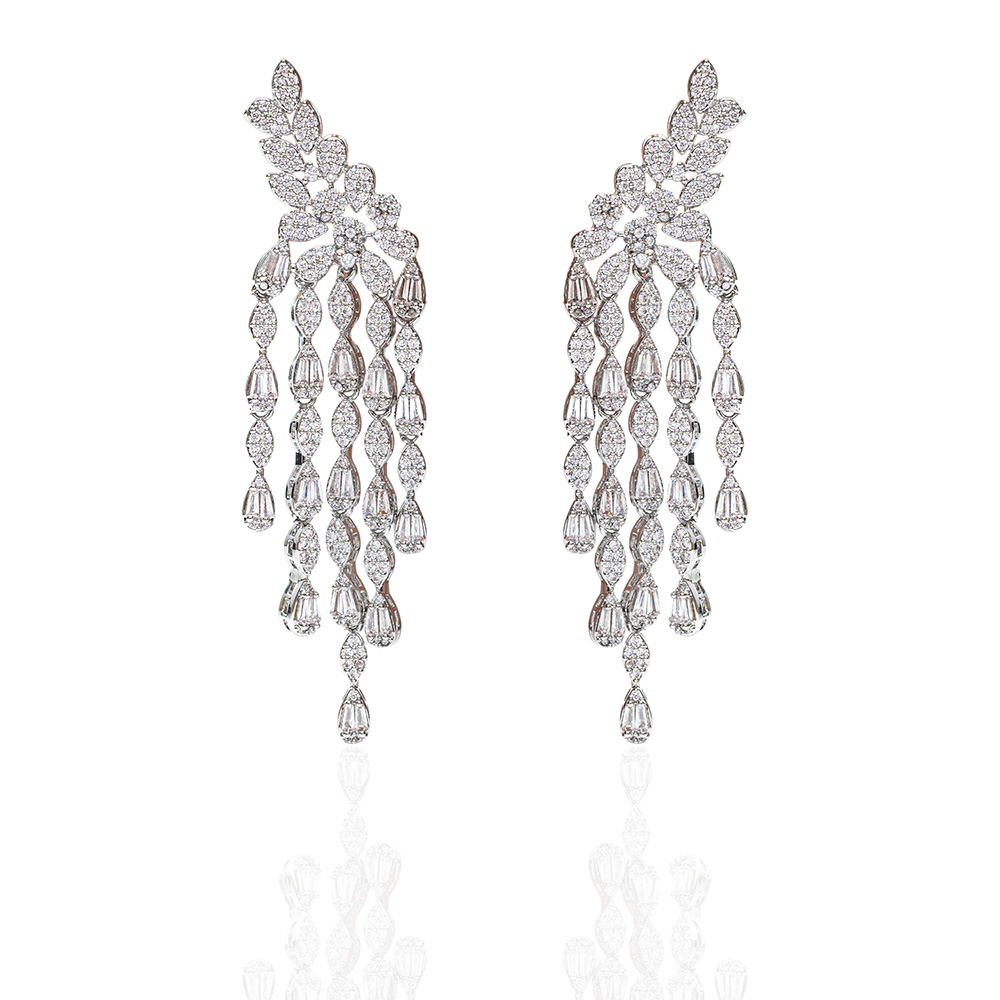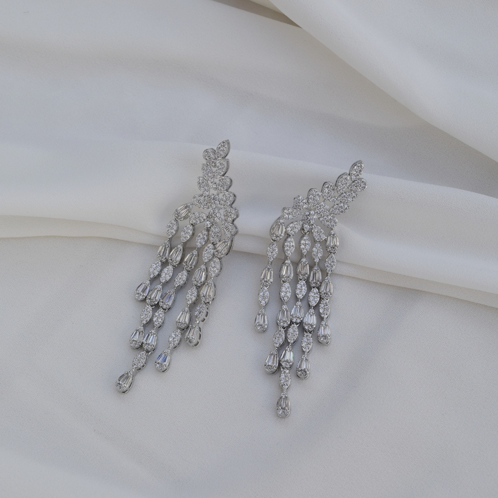 Confeccionado em metal com banho de ródio, o brinco recebe aplicação de zircônias cuidadosamente cravejadas, garantindo luminosidade intensa e acabamento refinado. O balanço suave das franjas adiciona leveza à peça, tornando-a ideal para ocasiões especiais, festas e produções noturnas.
